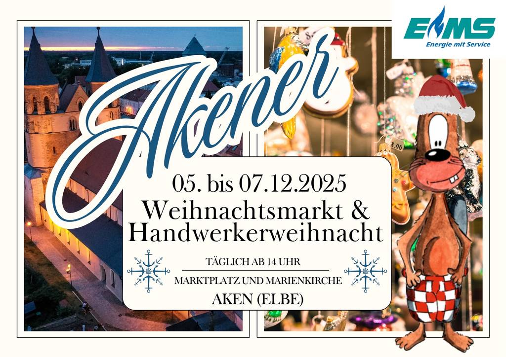 Kommt vorbei, bringt Familie und Freundeskreis mit und genießt ein Wochenende voller Musik, Handwerkskunst und weihnachtlicher Vorfreude mitten in Aken (Elbe). Ort: Marktplatz & Marienkirche · Zeit: 05.–07.12.2025, täglich ab 14:00 Uhr. Ein herzlicher Dank gilt unserem Partner EMS – Energie mit Service.