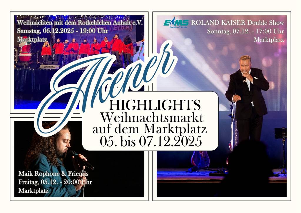 Der Samstag auf dem Marktplatz gehört dem Kultur- und Heimatverein Aken e.V. (ab 15:00 Uhr) und erneut dem Weihnachtsmann (16:30 Uhr). Am Abend beginnt um 19:00 Uhr „Weihnachten mit dem Rotkehlchen“ – ein besinnliches und zugleich mitreißendes Konzert. Sonntag übernimmt ab 15:00 Uhr der Narraria Aken e.V. das Programm, bevor um 17:00 Uhr die ROLAND KAISER Double Show (präsentiert von EMS) den krönenden Abschluss auf der Marktplatzbühne liefert.