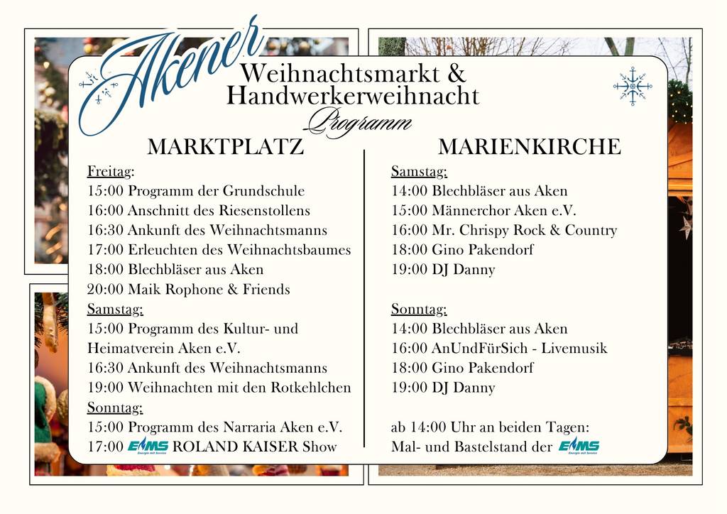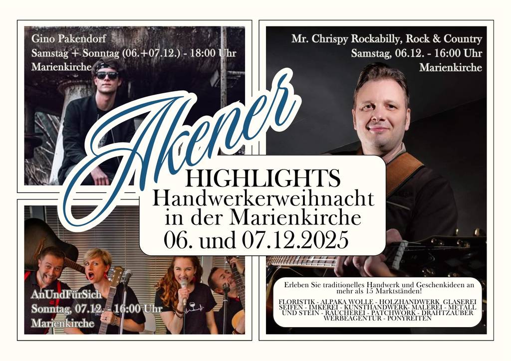 Parallel öffnet die Handwerkerweihnacht in der Marienkirche am Samstag und Sonntag ihre Pforten: Entdeckt an über 15 Marktständen liebevoll gearbeitete Geschenke und traditionelles Handwerk – von Floristik, Alpakawolle, Holzhandwerk, Gläserei, Seifen und Imkerei bis Kunsthandwerk, Malerei, Metall & Stein, Räucherei, Patchwork, Drahtzauber und mehr; sogar Ponyreiten ist dabei. Auf der Kirchenbühne spielen am Samstag die Blechbläser aus Aken (14:00 Uhr), der Männerchor Aken e.V. (15:00 Uhr), Mr. Chrispy – Rock & Country (16:00 Uhr), Gino Pakendorf (18:00 Uhr) und DJ Danny (19:00 Uhr). Am Sonntag geht es weiter mit den Blechbläsern aus Aken (14:00 Uhr), AnUndFürSich – Livemusik (16:00 Uhr), erneut Gino Pakendorf (18:00 Uhr) und DJ Danny (19:00 Uhr). Für Kinder gibt es an beiden Tagen ab 14:00 Uhr den Mal- und Bastelstand von EMS.