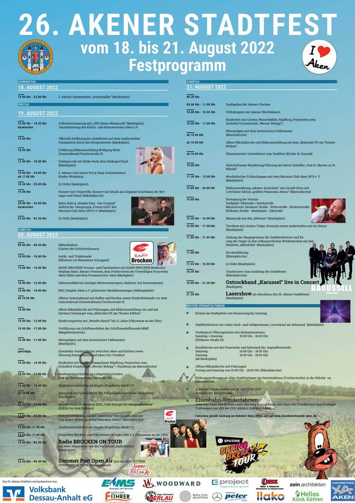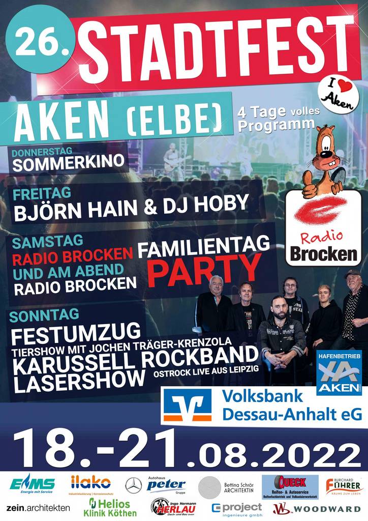 Nach zweijähriger "Zwangspause" wird in der Stadt Aken (ELbe) am dritten Augustwochenende das mitlerweile 26. Akener Stadtfest veranstaltet.
