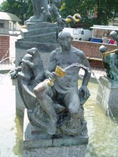 Nichts als das nackte Leben hat das "junge Paar” vor dem Hochwasser der Elbe gerettet. Haus, Hof und Vieh fielen oftmals der Naturgewalt des Flusses zum Opfer. Diese Figurengruppe erinnert an Segen und Gefahr der Stadt an der Elbe.
