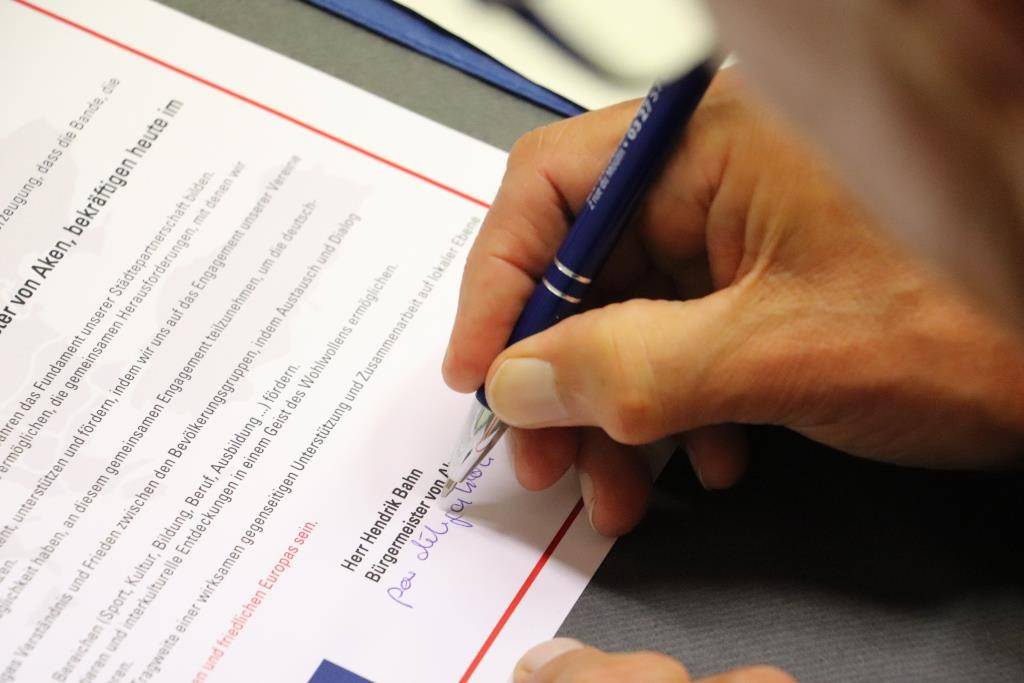 Im Anschluss wurde die Erneuerung der Städtepartnerschaft, bei der auch der Deportierte der Region anwesend war, nach dem Abhalten diverser Reden, mit der erneuten Vertragsunterzeichnung durch Jean-Luc Perat und in Vertretung des Bürgermeisters durch Herrn Dr. Seibt als ältestes Mitglied des Stadtrates der Freundschafts- und Partnerschaftsvertrag zwischen Anor und Aken durch Unterschrift besiegelt.