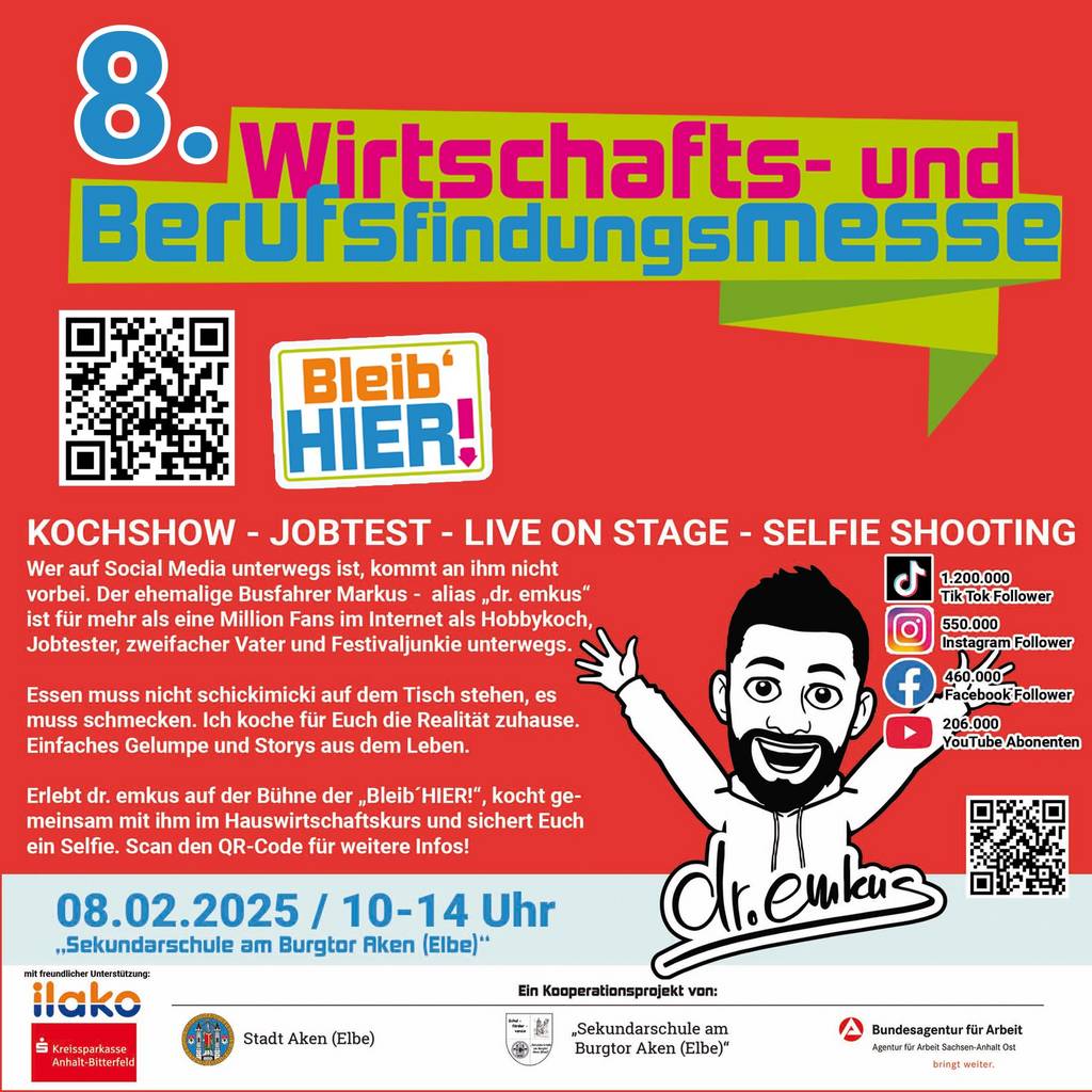 nutzt die Chance! Kommt vorbei und informiert Euch über Ausbildungsmöglichkeiten in und um Aken. Stargast der Messe ist Tik Toker und Influencer DR. EMKUS aus Gera. Es erwarten Euch zudem coole Mitmachangebote von den Unternehmen und unsere Top Moderatoren INGO und LARS. Lernt die Unternehmen kennen und schaut was zu Euch beruflich am Besten passt. Ein professioneller Fotograf erstellt Dir kostenfrei digitale Bewerbungsfotos. Weiterhin gibt es beim Berufsquiz wieder hochwertige Preise zu gewinnen.