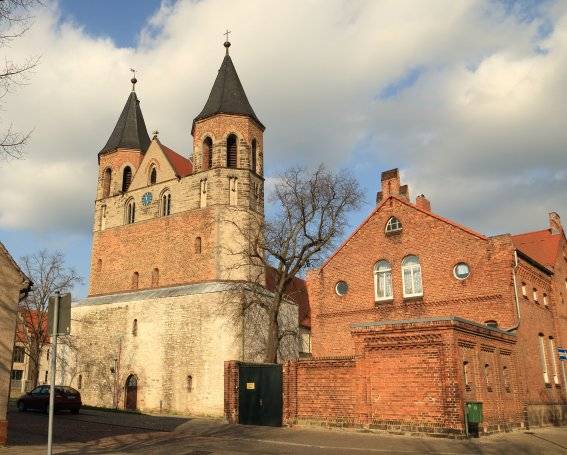 Die Marienkirche wurde 1188 im romanischen Stil erbaut und ist mit den 38 m hohen Doppeltürmen weithin sichtbar. Bei dem großen Stadtbrand 1485 ist die Marienkirche abgebrannt. Sie wurde dann nach dem Vorbild der Nikolaikirche wieder aufgebaut. Die Marienkirche war die Kirche der Bürger, der Kaufleute und der Handwerker. Mit der Reformation 1540 wurde die Marienkirche evangelisch. Die Ausstattung war prächtig. Leider ist die Kirche im Laufe der Jahre immer mehr verfallen, so dass sie 1975 von der Kirchengemeinde aufgegeben werden musste. 1992 übernahm die Stadt Aken die Kirche und 1993/94 begannen die Sanierungsarbeiten mit einer umfangreichen Restaurierung der beiden Türme. Die Kirche ist zur Zeit für Besucher nicht zugänglich, da die Sanierungsarbeiten noch mehrere Jahre in Anspruch nehmen werden.. Mit der Schließung der Marienkirche wurden der Marienaltar (1490), das Kruzifix (1460) und die Röver-Orgel in die Nikolaikirche umgelagert.