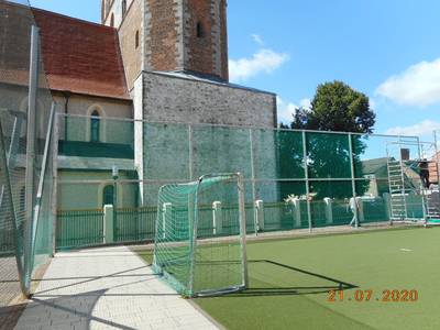 Um die Sicherheit der Kinder und den Schutz der Marienkirche zu gewährleisten, wurde auf der Südseite des Schulhofes ein Ballfangnetz errichtet.